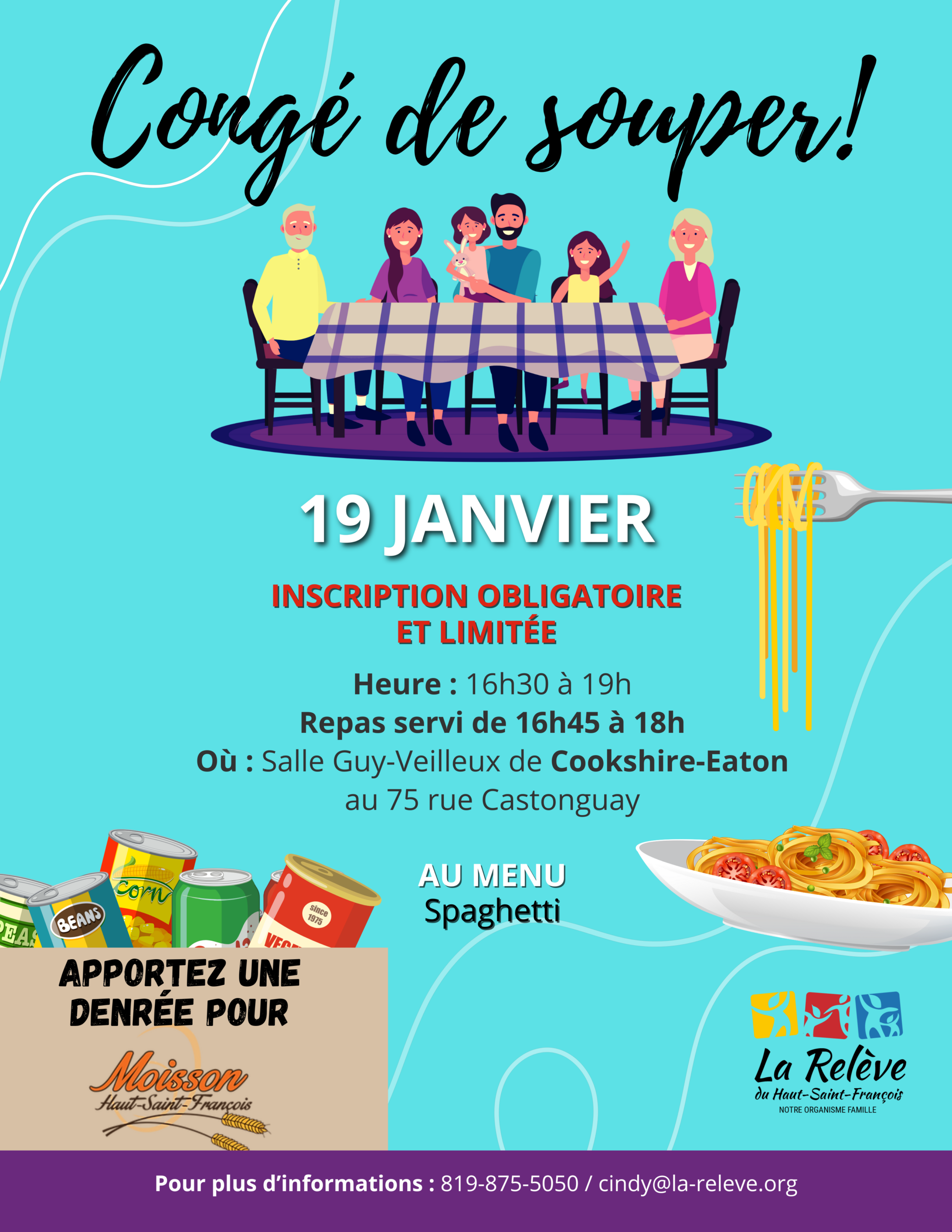 Souper spaghetti. Amène une denrée! Elles seront données à Moisson HSF pour leurs paniers ! **contribution volontaire **