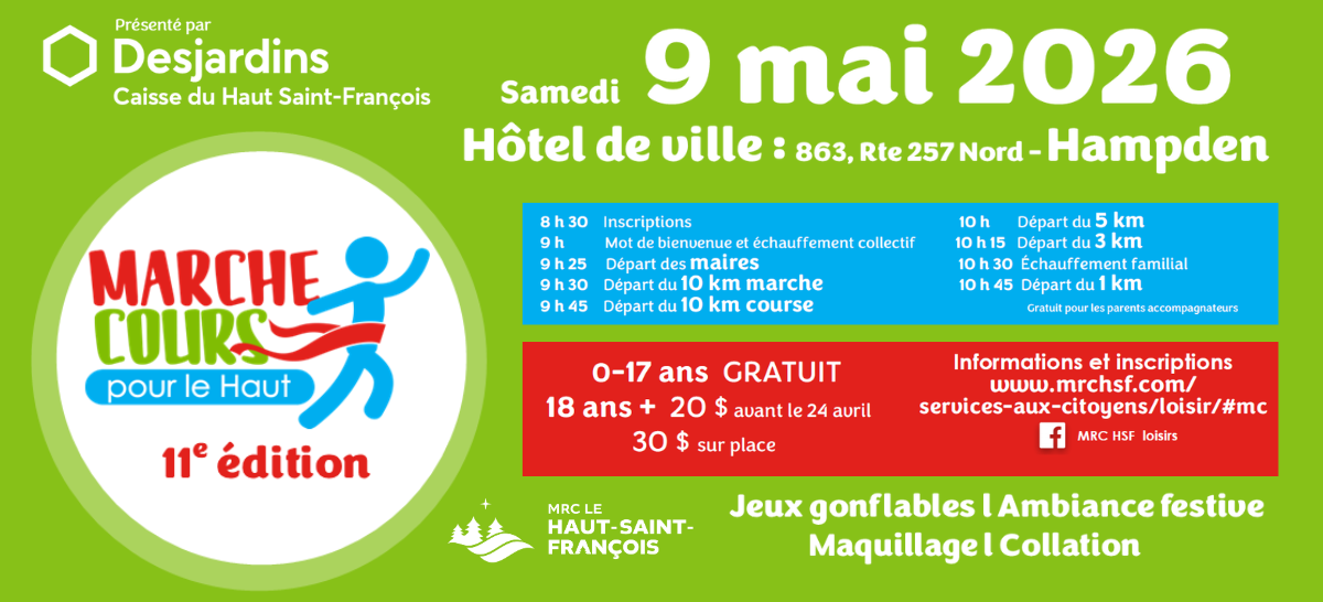 RAPPEL Les profits de la journée serviront à soutenir les familles du Haut-Saint-François pour la pratique d’activités sportives, physiques et culturelles. Tous les détails du Fonds Marche/cours pour le Haut