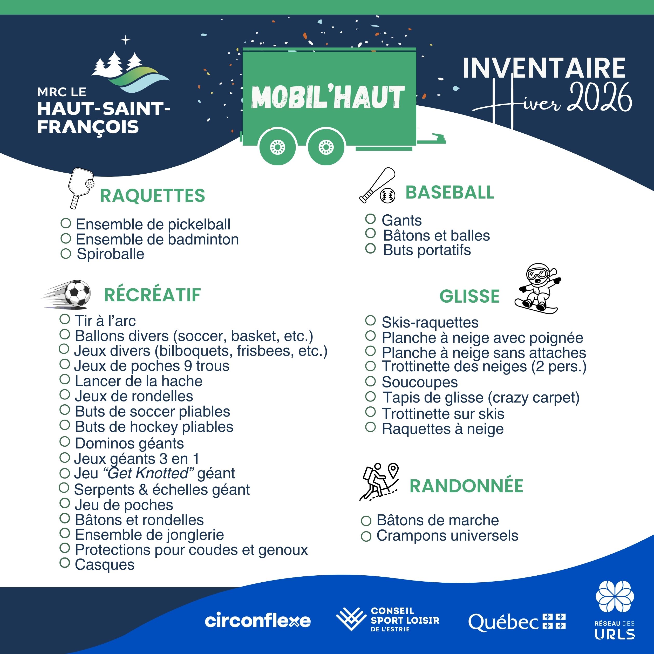 Une rotation de matériel est effectuée 2 fois par année avec du matériel reflétant les saisons. Chapeauté par la MRC, en collaboration avec la ville d’East Angus et la municipalité de Saint-Isidore-de-Clifton, le comité est fier de les mettre les remorques en circulation depuis février 2026!